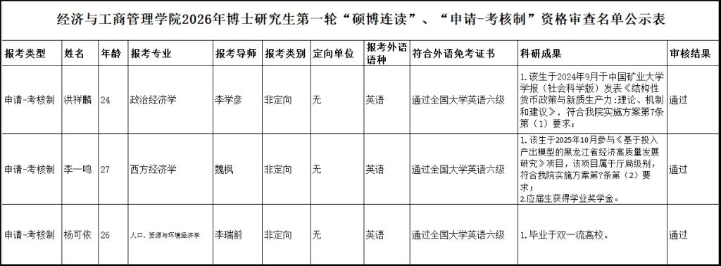 经济与工商管理学院2026年博士研究生第一轮 “硕博连读”“申请-考核制”资格审查名单公示