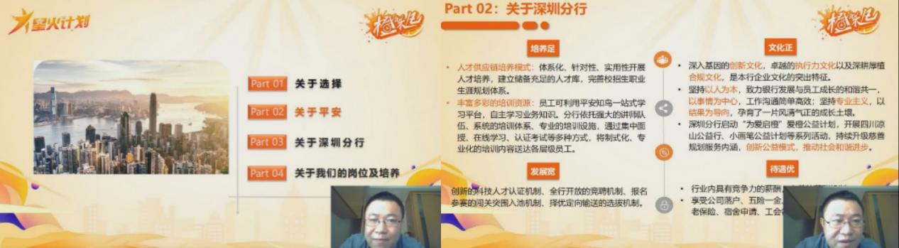 平安银行深圳分行系平安银行系统内最大规模分行,其资产总量、盈利能力、存款规模都在系统内首屈一指。宣讲会伊始,周经理首先介绍了公司所在地——深圳的城市魅力,介绍了深圳这座年轻城市创造出的各项“奇迹”,分享了深圳为年轻人提供的机会和便利。随后,他为同学们介绍了单位的基本情况,介绍了集团发展前景、企业文化,着重说明了公司的财务体系组织架构、员工培养、岗位需求、薪资待遇和发展前景等。最后,就同学们提出的问题给予一一解答。