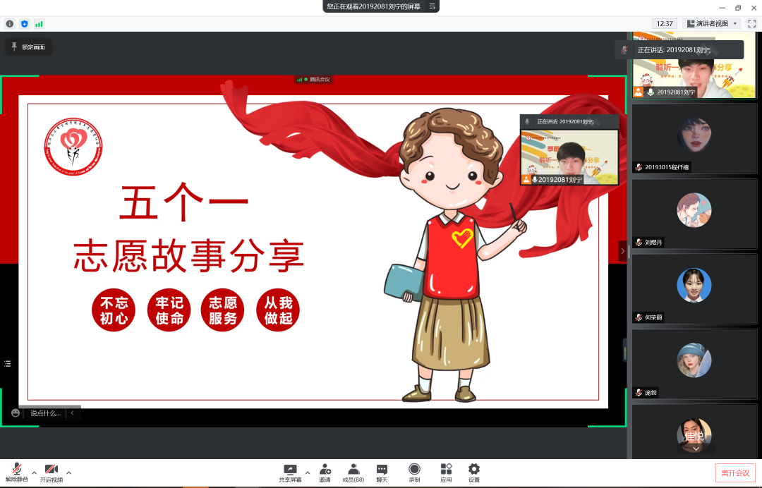 每参与一次志愿服务活动,都是一次难得的成长和历练,都是一次爱心与温情的表达。在云端分享活动中,10余名志愿者向同学们讲述了志愿服务照片、活动视频背后的暖心故事,那些记录他们点滴成长的精彩瞬间,仿佛就在眼前。通过开展志愿服务经历讲述活动,帮助更多同学们深刻感悟志愿服务的精神内涵,极大地激发了同学们参与志愿服务的热情,营造了良好的互助氛围。