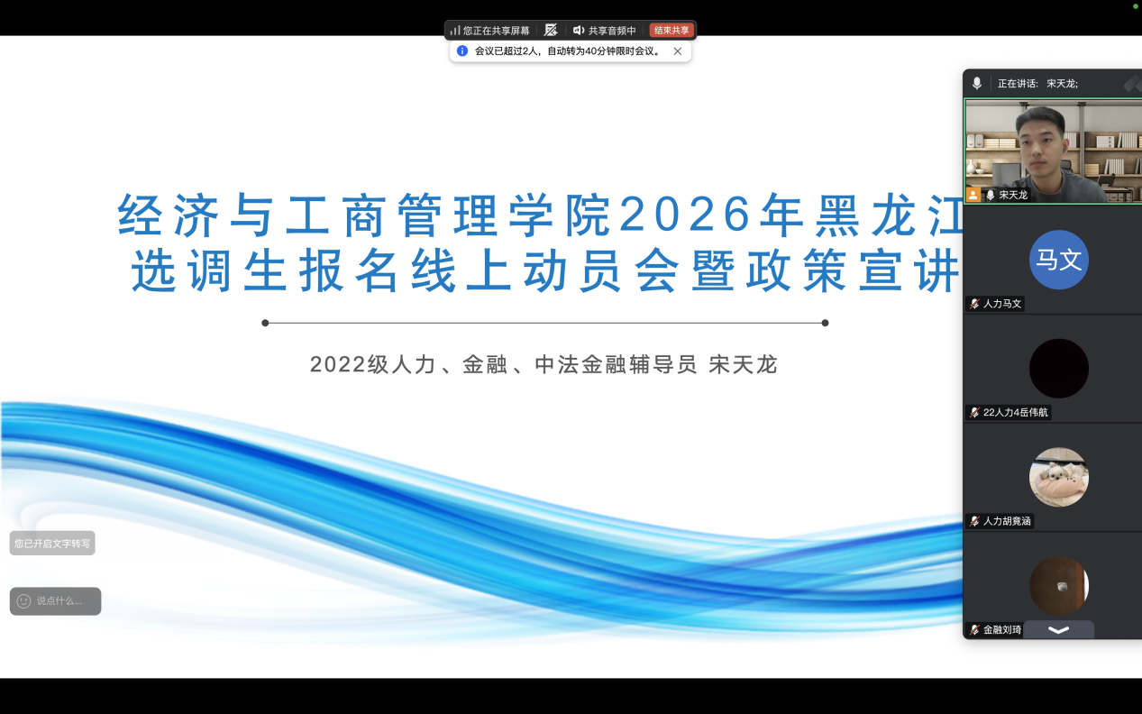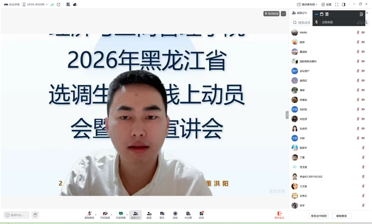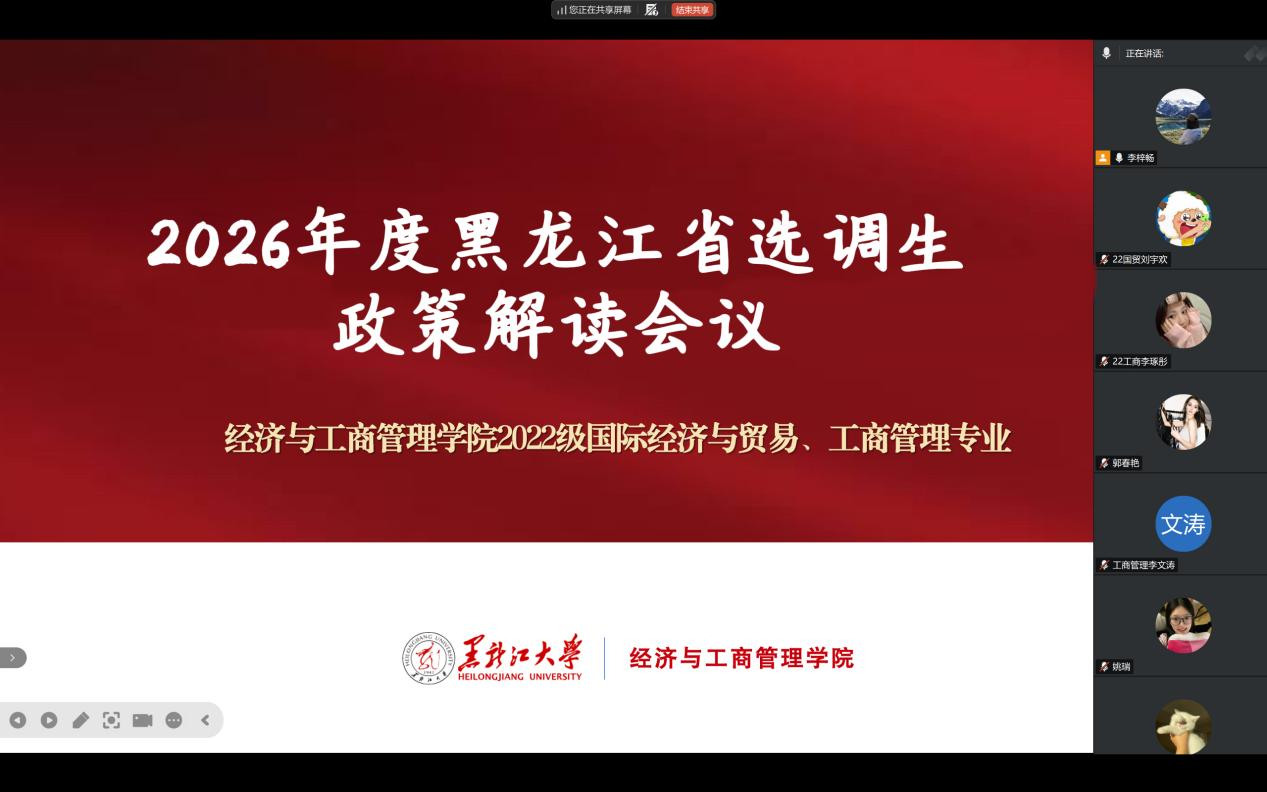 为精准落实黑龙江省2026年选调生招录工作部署要求,扎实推进优秀应届毕业生基层培养计划,引导青年学子投身基层一线、勇担时代使命,1月24日,经济与工商管理学院组织召开2026年黑龙江省选调生政策解读暨动员宣讲会,毕业年级辅导员宋天龙、李梓畅、刘佳明、李帛芮、董洪阳主持会议,学院2026届应届毕业生参会。