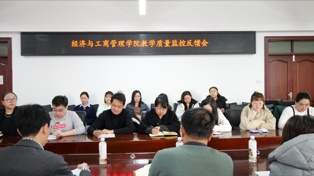 为深入落实学校本科教学质量监控工作部署,精准查摆教学短板、持续提升人才培养质量,3月18日下午,经济与工商管理学院在汇文楼847会议室召开本科教学质量监控反馈会。会议由教学副院长李瑞前主持,校督学常树春、学院督导杨彩霞和徐泓出席,学院领导班子、系主任及专任教师参加会议。